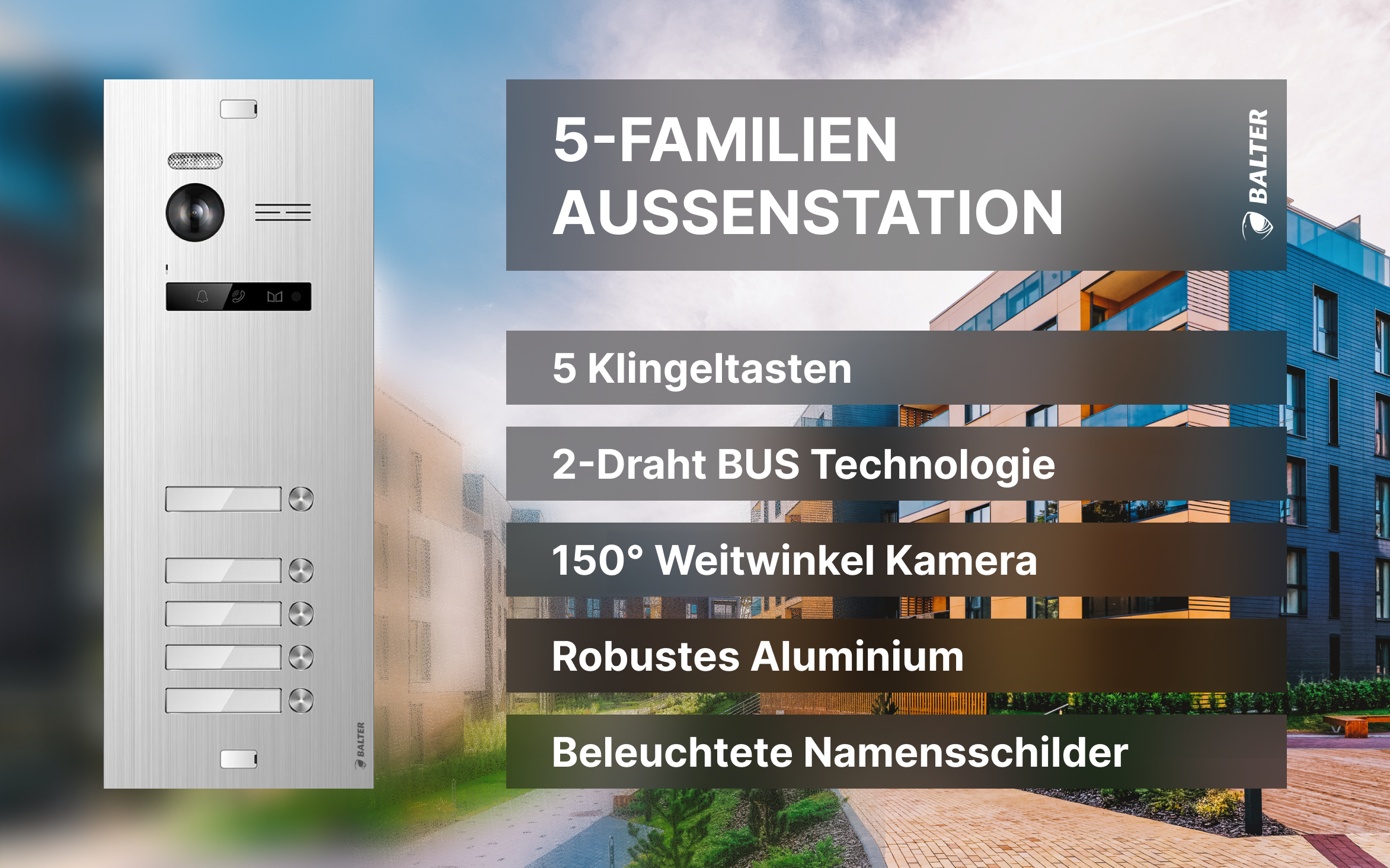 BALTER EVO Silver Türstation für 5 Teilnehmer, 2-Draht BUS Technologie (Video / Audio / Strom), 150° Weitwinkelkamera